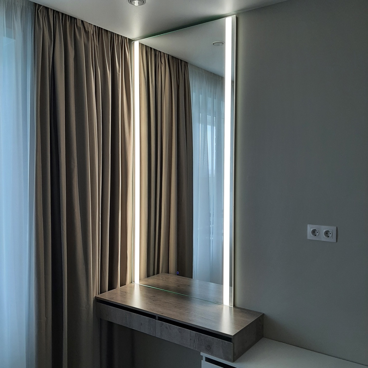 Настройка зеркала с встроенной подсветкой осуществляется нашими специалистами. На этапе предварительной настройки, подключаются все необходимые комплектующие в единую электрическую цепь. Светодиодная лента, сенсорные датчики, преобразователи напряжения, устройства подогрева, коннекторы и иные элементы соединяются к одному проводу, который выводится с обратной стороны зеркала. Следующим этапом является настройка подсветки в момент подключения к сети заказчика.